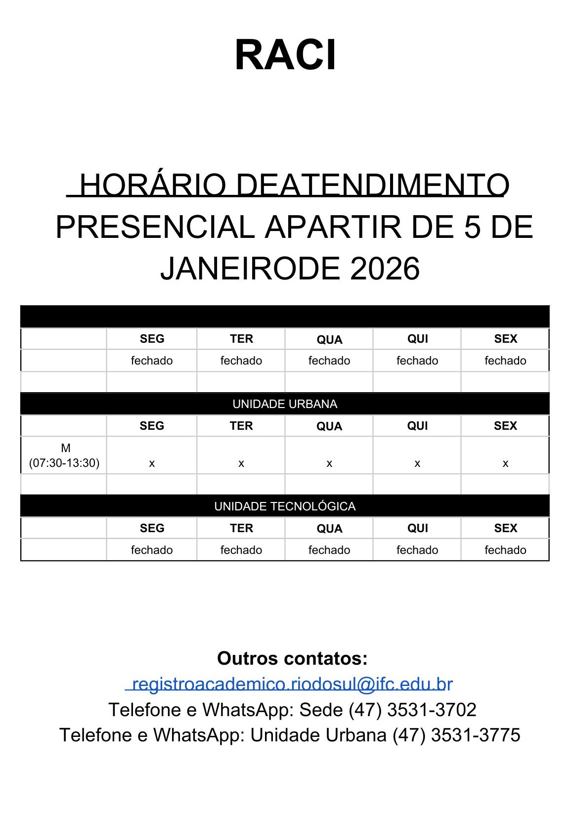 Você está aqui: Página inicial > Portal do campus Campus Rio do Sul > RACI - Registro Acadêmico e Cadastro Institucional > Horário de Atendimento